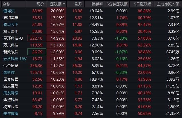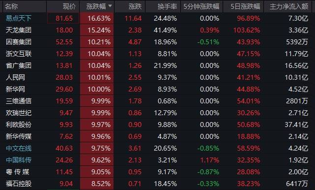 值得买20%涨停,易点天下、科大国创、海天瑞声、汉文在线涨超10%,浙文互联、东谈主民网、新华网、焦点科技、欢瑞世纪、新华传媒、三维通讯、卓易信息、天娱数科、岩山科技等个股批量涨停。