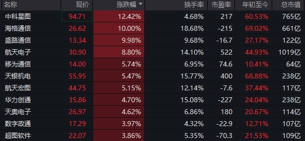 贸易航天成见在昨日大幅改换之后有所回暖,中国卫星翻红,盘中一度跌超7%,中科星图涨超12%,海格通讯10%涨停,航天电子、航天宏图等涨幅居前。